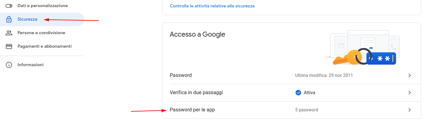 - Nel menu a sinistra, cliccare su Sicurezza e poi su Password per le App.