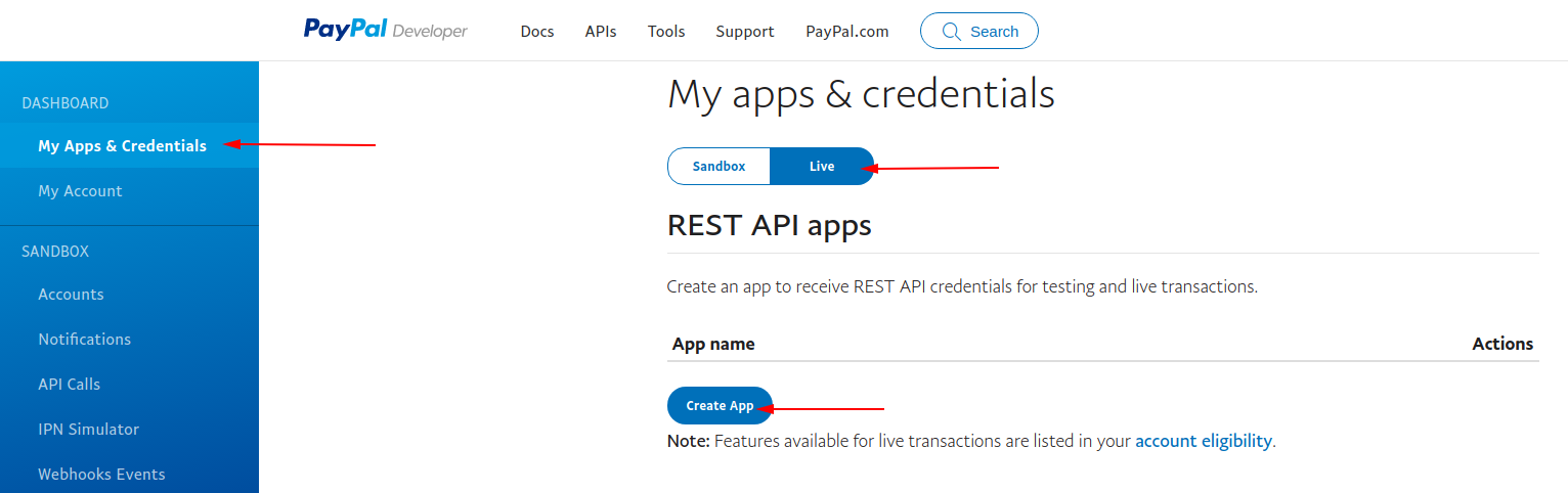 • Esegui il login sulla sezione Developer e clicca su Create app. ATTENZIONE! Nella parte alta della pagina va indicata la modalità LIVE e non SANDBOX!