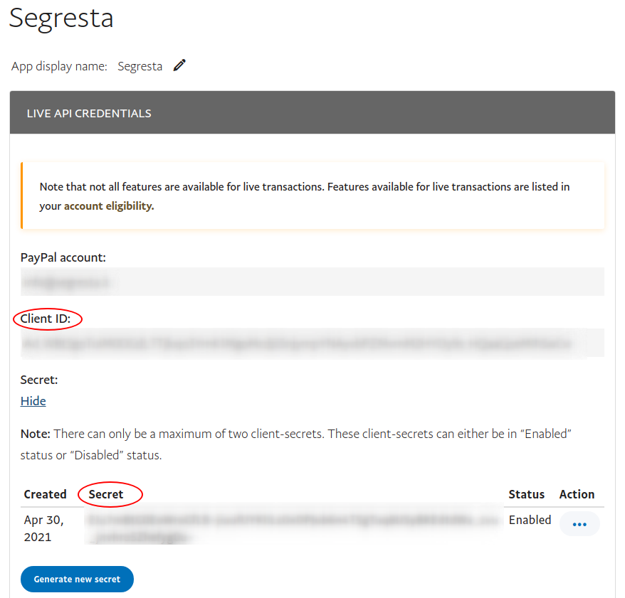 • Copia il Client ID e Client Secret nella configurazione di Segresta
