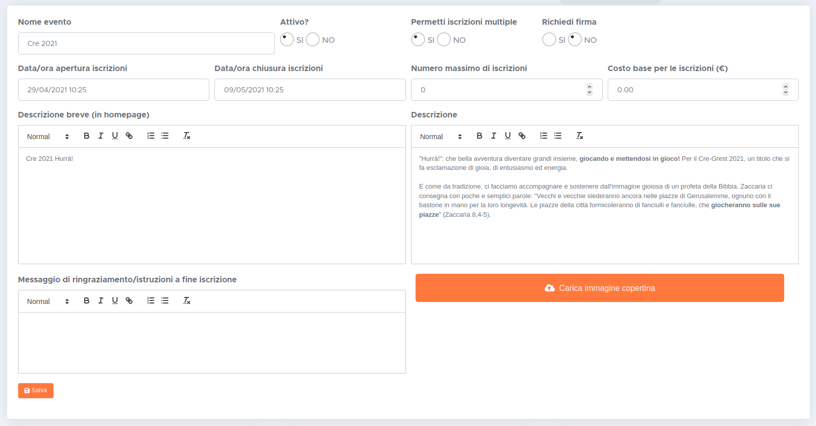- Numero massimo di iscrizioni: utile nel caso l'evento ha posti limitati. Lasciare 0 per iscrizioni illimitate.